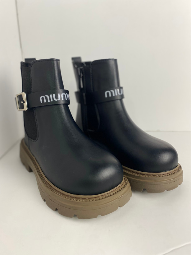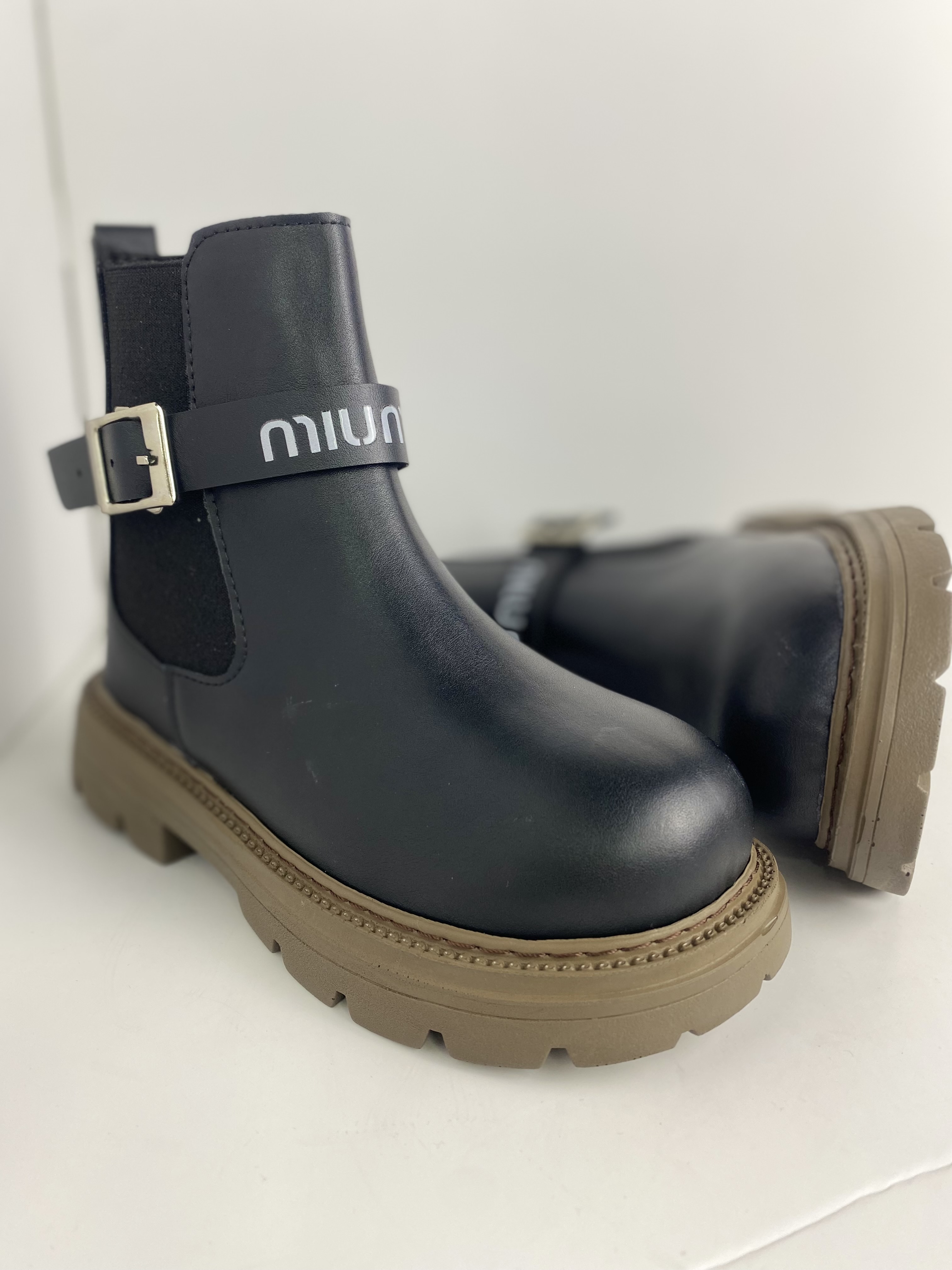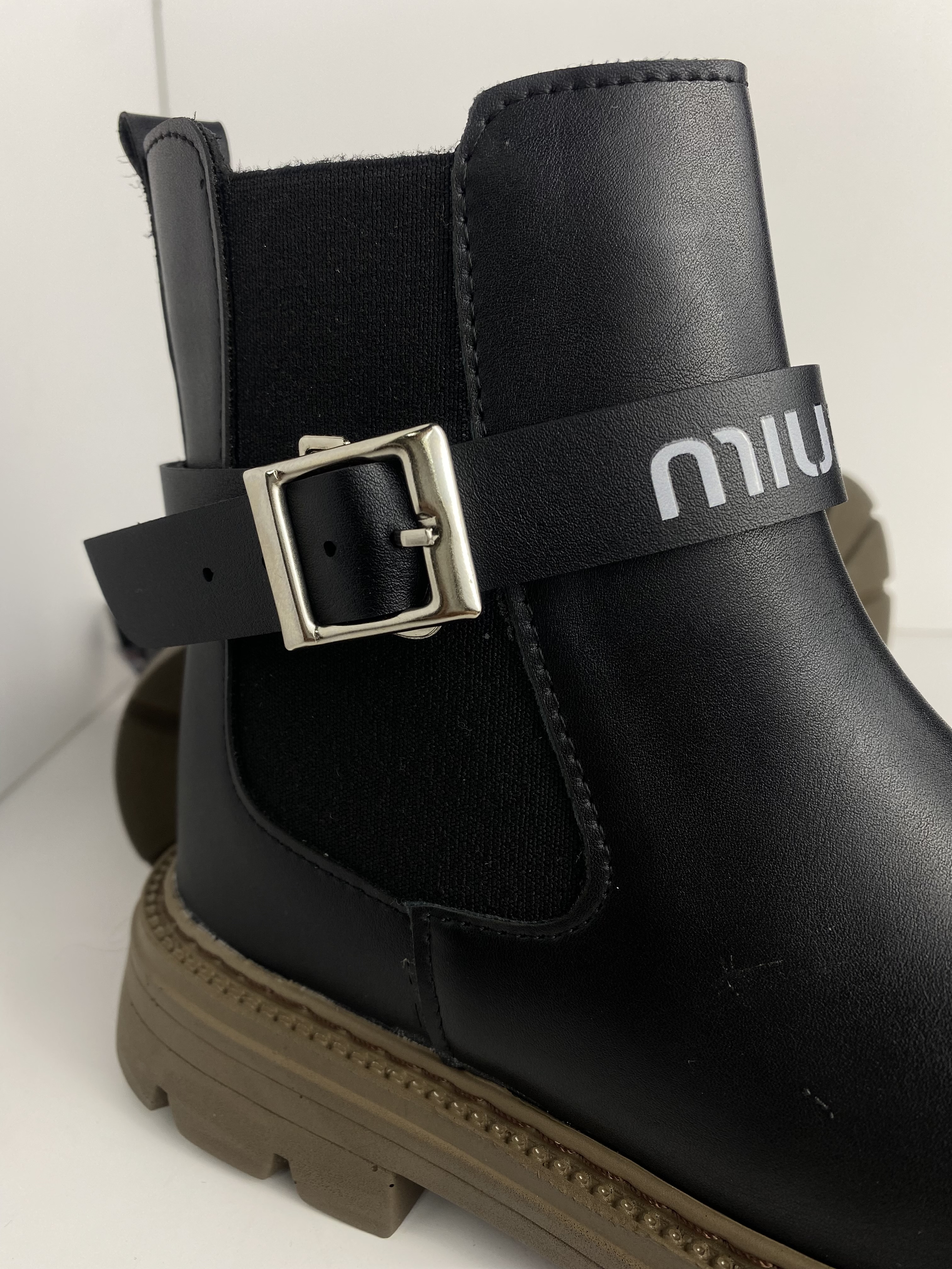 این مدل نسبت به بوتهای ساده، ظاهر شیکتر و مدرنتری داره؛ بند سگکدار باعث شده بوت روی پا خیلی مرتب دیده بشه و لوگوی MIU هم حس فشن و برند بودن به کار داده.