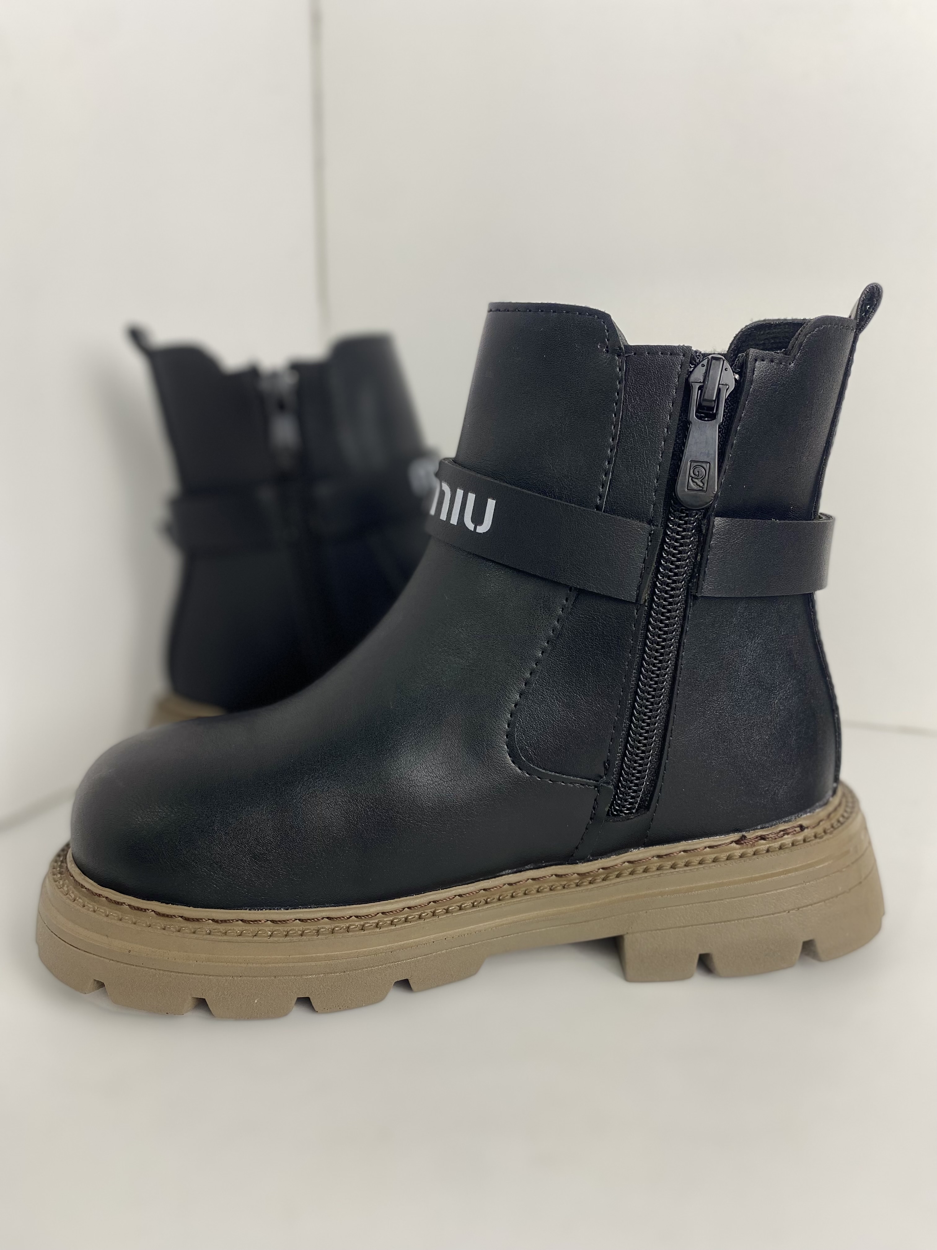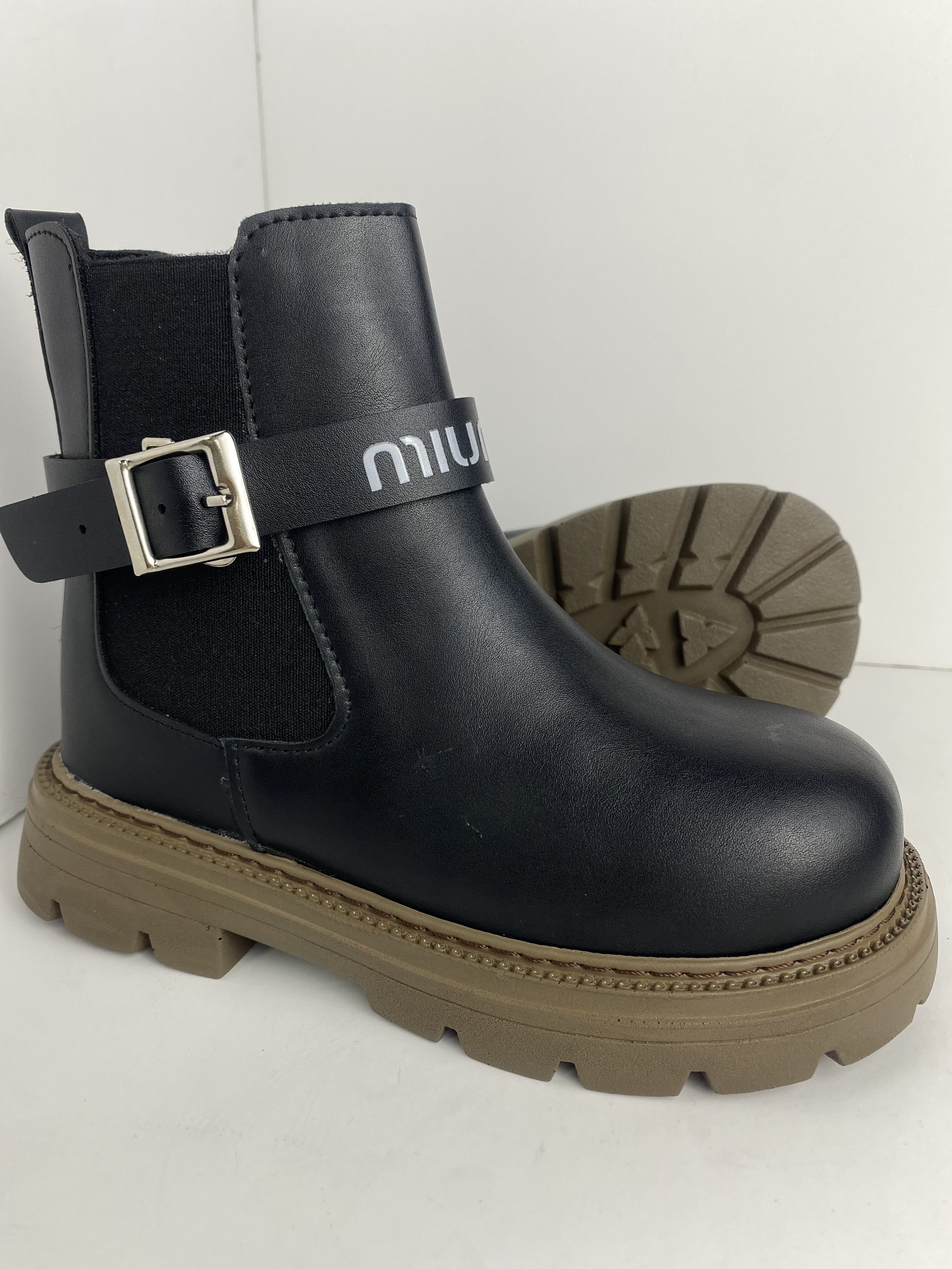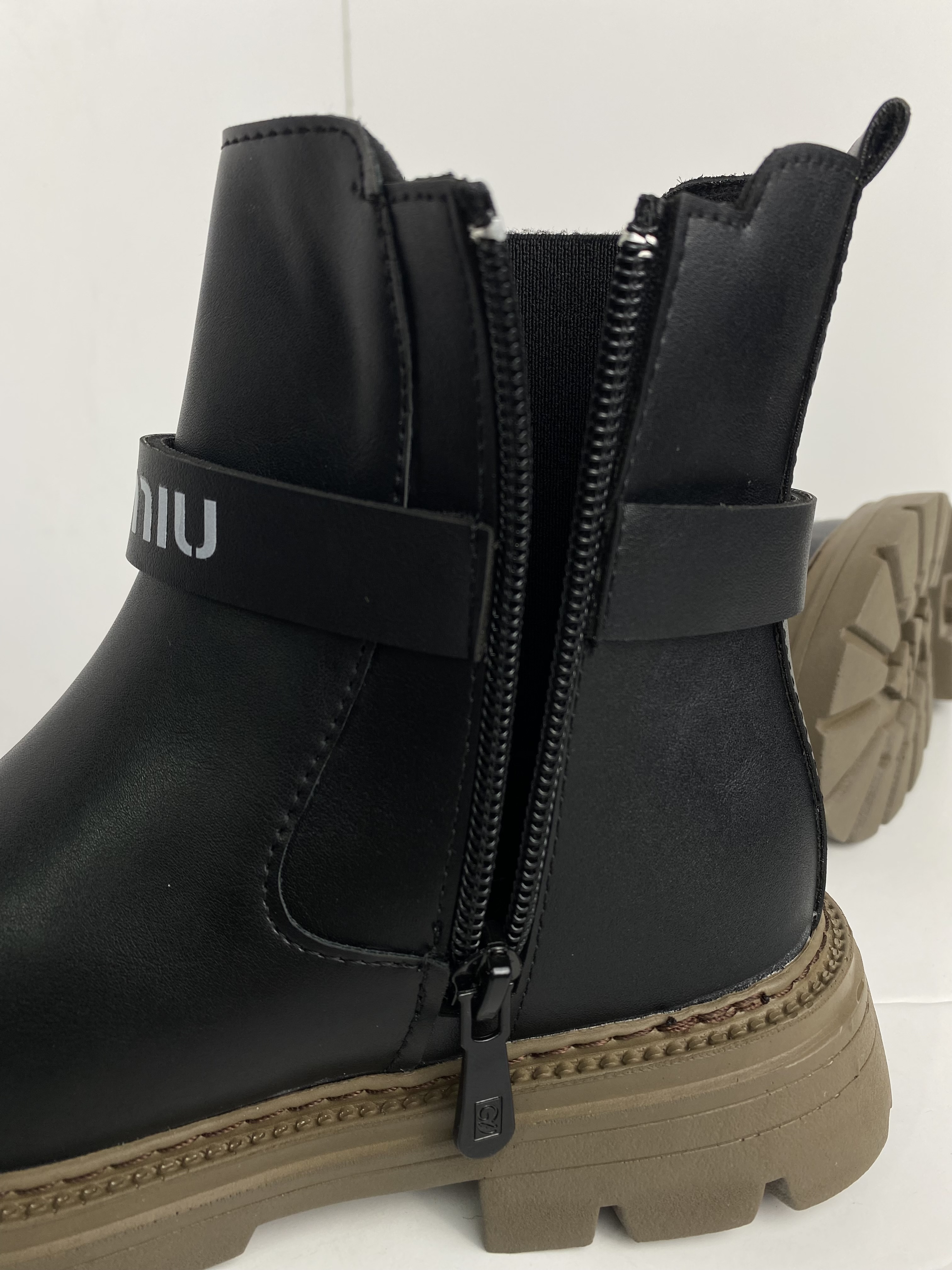 این مدل نسبت به بوتهای ساده، ظاهر شیکتر و مدرنتری داره؛ بند سگکدار باعث شده بوت روی پا خیلی مرتب دیده بشه و لوگوی MIU هم حس فشن و برند بودن به کار داده.